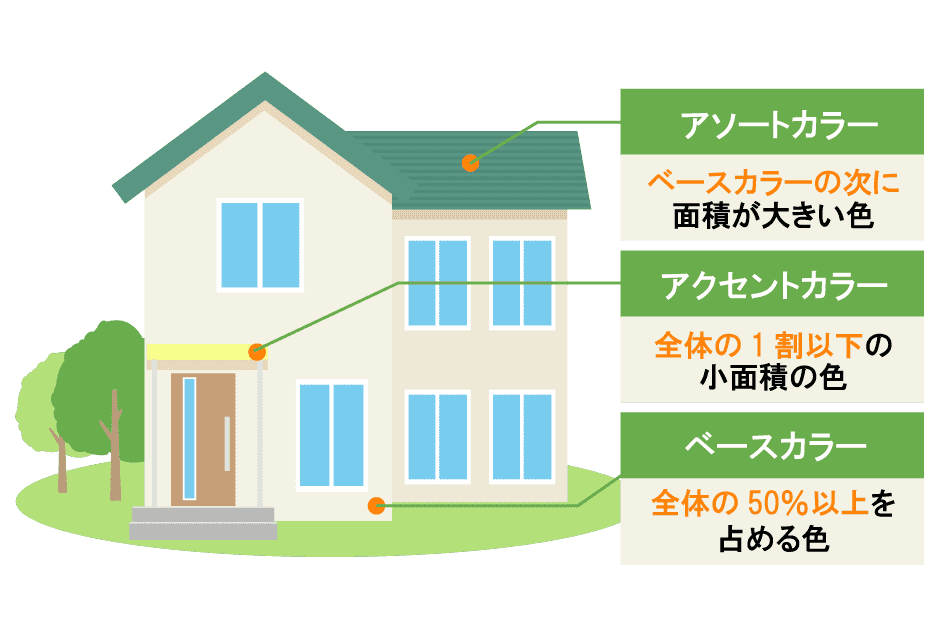 ベースカラー、アソートカラー、アクセントカラーの3色を基本とし建物の配色構成を考えていきます。カラーシミュレーションを行なうお住まいや建物、その背景となる周辺の街並みとの関係、塀や門といった建物外観を構成するデザインの特徴や与えるイメージに応じて、配色構成を考えていきます。